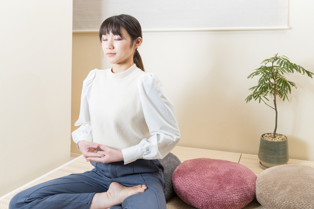 La posture : asseyez-vous le dos droit, les jambes croisées ou en tailleur. Les mains se posent l’une sur l’autre, paumes vers le haut, pouces qui se touchent légèrement. Le regard reste posé à quelques mètres devant vous, sans fixer un point précis.
